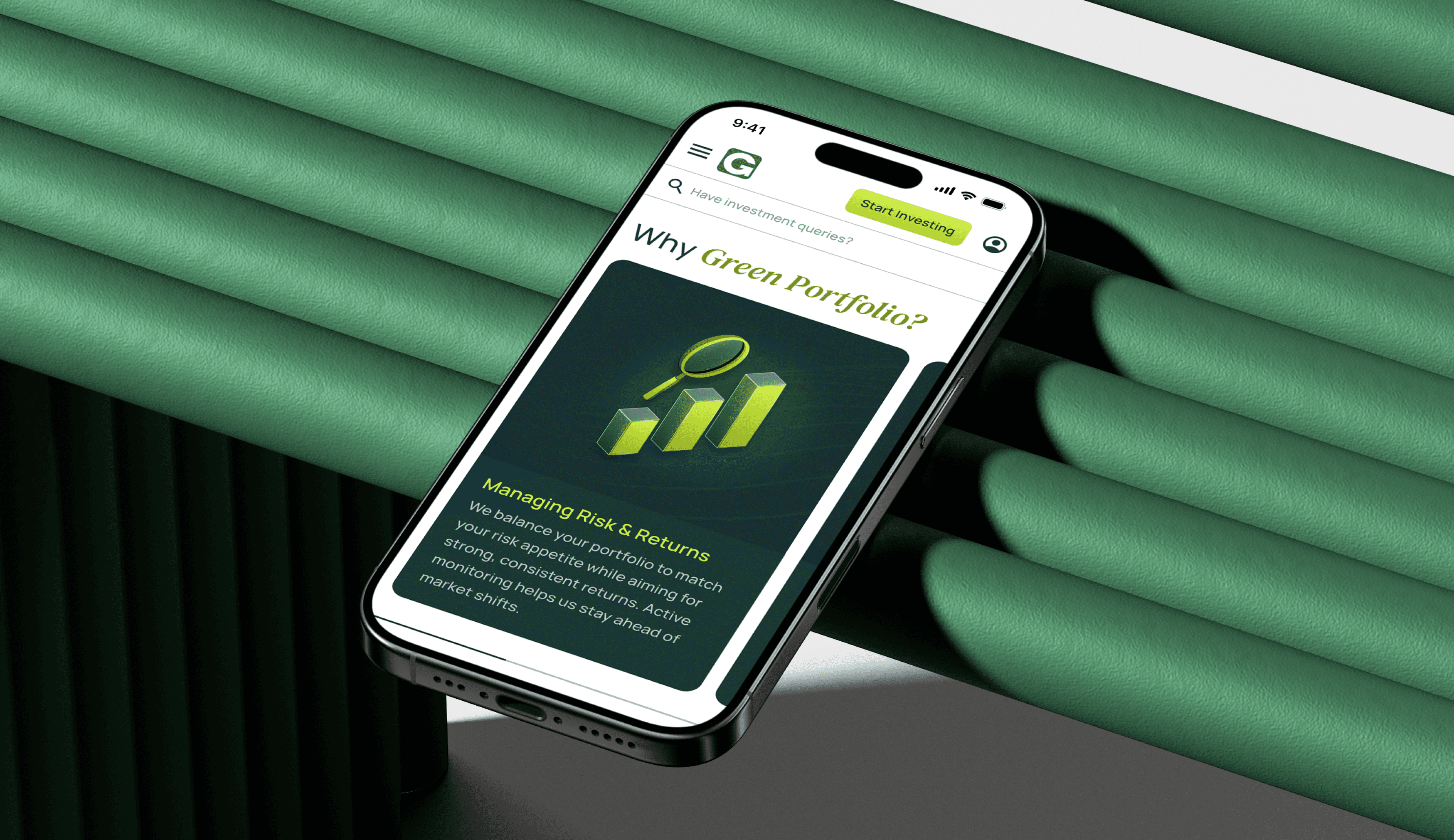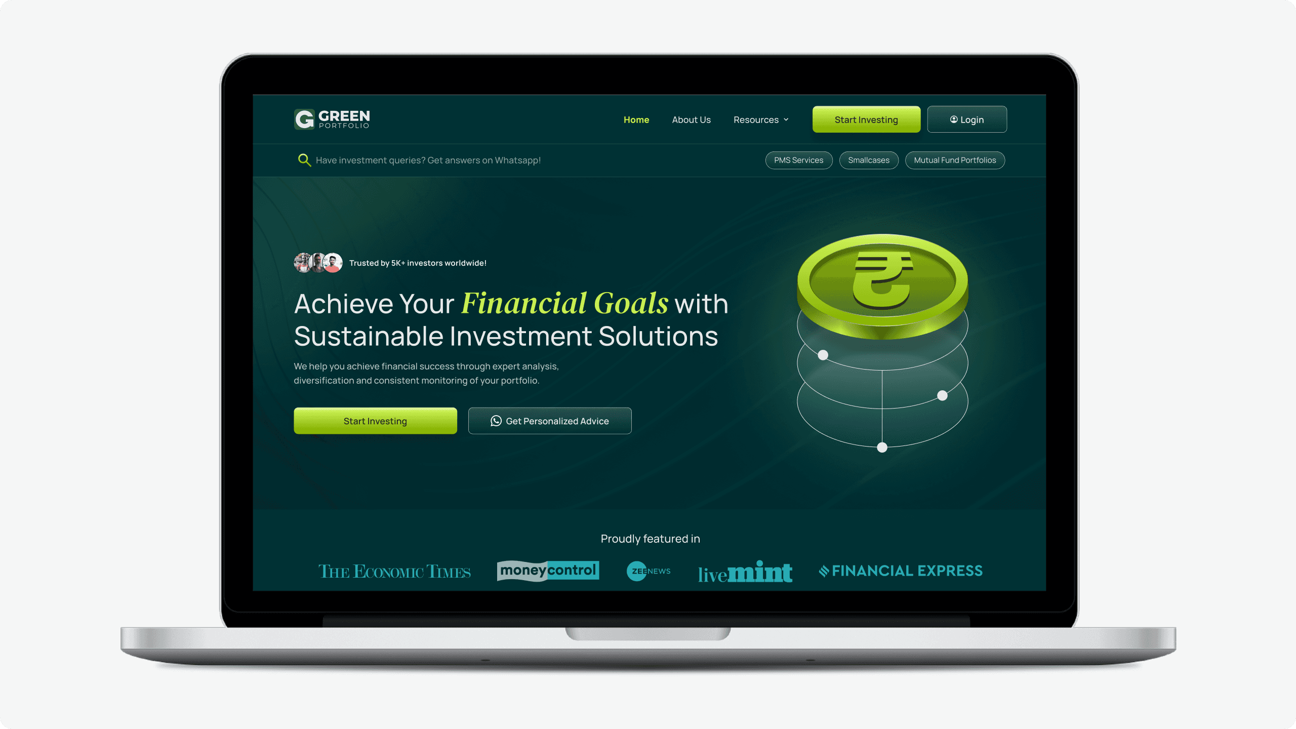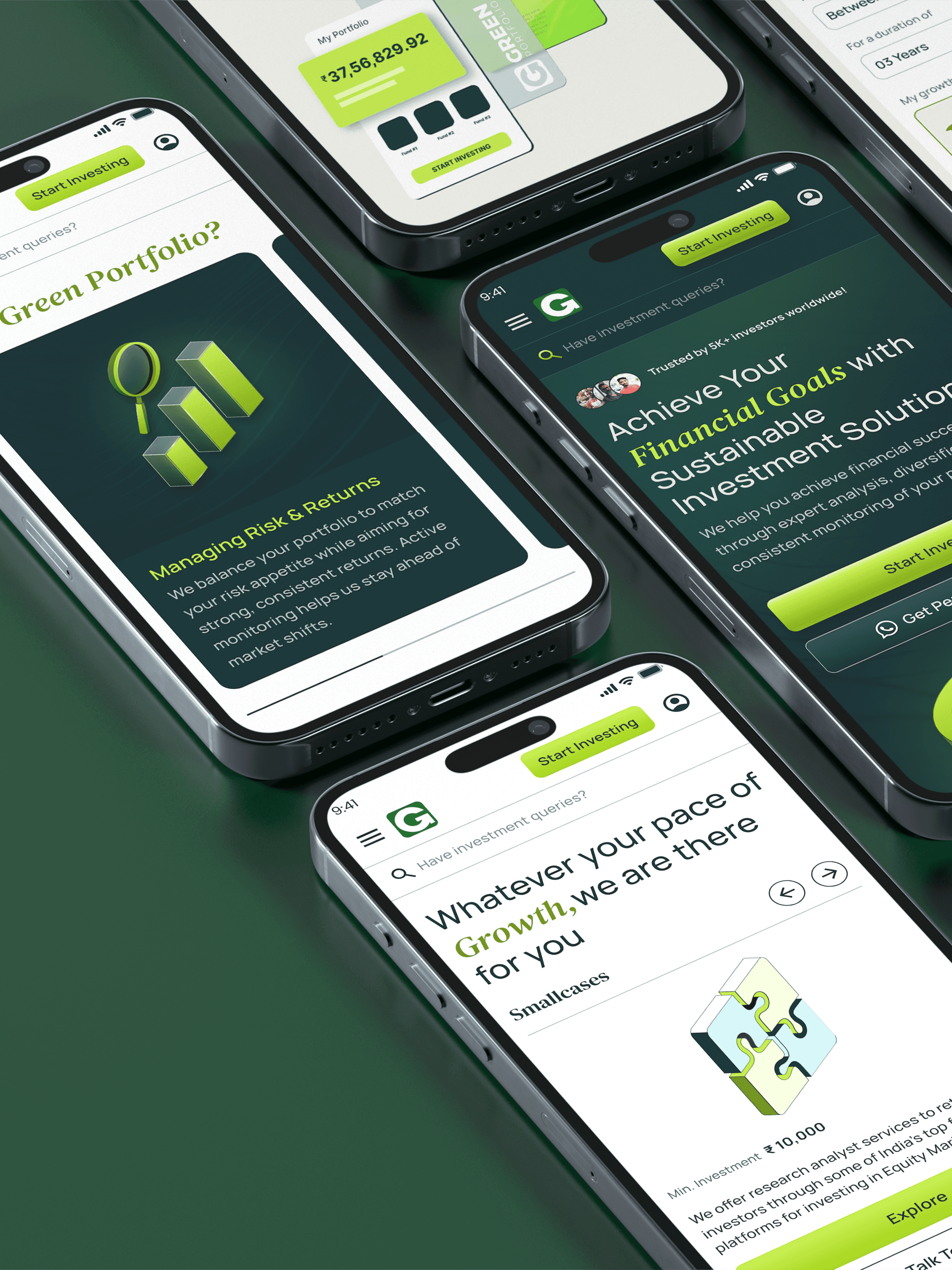 Green Portfolio aimed to establish a credible and conversion-focused digital presence for their investment offerings. The primary goals were to clearly communicate their value proposition, build trust with high-intent investors, and enable users to discover and invest in portfolios aligned with their financial goals.